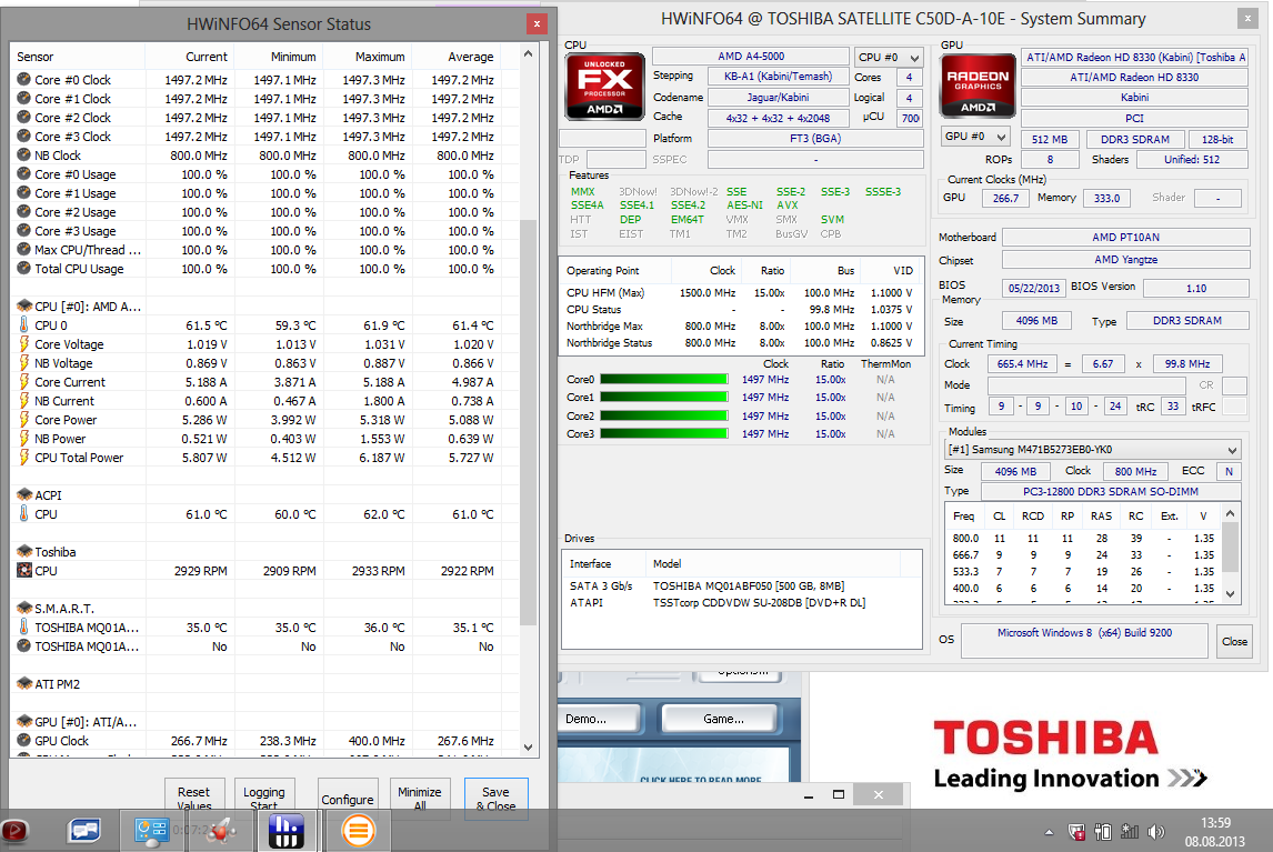 Der AMD A4-5000 ist eine Low Voltage APU (TDP 15 Watt) für Subnotebooks und Laptops. Sie positioniert sich über A6 und unter A8/A10 als das neue Mainstream-Modell für preisgünstige Geräte. In parallelisierten Anwendungen kann die APU zur Form eines Sandy Bridge Core i3 (LV) auflaufen. Das Paket wird durch eine integrierte Radeon HD 8330 sowie durch eine Toshiba Festplatte mit 500 GB (brutto) ergänzt. Für die vier Gigabyte RAM sitzt der Controller direkt im SoC, also auf dem Chip der APU.