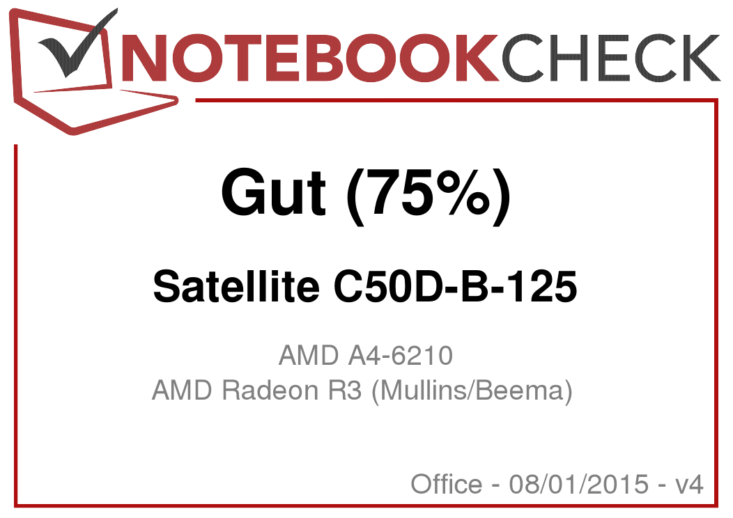 Bei dem Toshiba Satellite C50D-B-125 handelt es sich um ein einfaches Office-Notebook im 15,6-Zoll-Format. Die Rechenleistung reicht für Anwendungen aus den Bereichen Office und Internet aus. Der Rechner erwärmt sich kaum, wird im Idle-Modus aber zu laut. Hier sollte Toshiba schnell nachbessern. Zudem ist das Notebook mit einer ordentlichen Tastatur bestückt und kann sich mit guten Akkulaufzeiten schmücken. Der Bildschirm wartet mit einem guten Kontrast aus, leuchtet aber etwas zu dunkel. Für die Nutzung in Gebäuden reicht die Helligkeit jedoch völlig aus. Leider bringt das Satellite - im Gegensatz zum Vorgänger - keine Wartungsklappe mehr mit. So ist ein schneller Tausch der Festplatte nicht mehr möglich. Den Preis setzt Toshiba mit 410 Euro recht hoch an. Für weniger Geld sind deutlich leistungsstärkere Notebooks zu bekommen. So ist beispielsweise das kürzlich von uns getestete HP 355 G2 (A8-6410, Radeon R5 M240, Windows 7 Pro + Windows 8.1 Pro) bereits für 370 Euro zu haben.