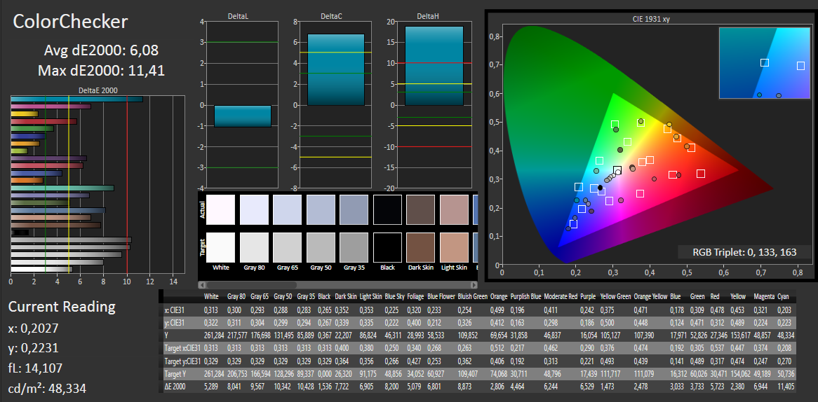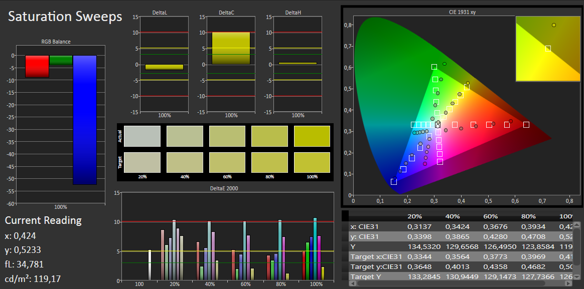 Die gemessenen Farbabweichungen halten sich mit einem durchschnittlichen DeltaE(2000)-Wert von 6 in Grenzen, die allgemein überbetonten Blautöne sorgen allerdings für einen leichten Farbstich, der besonders auf mittelhelle Grautöne durchschlägt. Der Blaustich vermittelt einen leicht kühlen Bildeindruck.