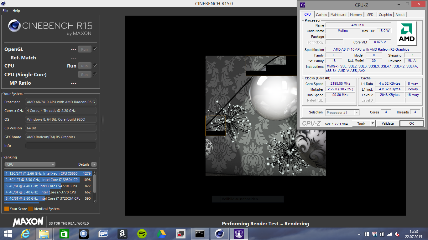 Die schlechte Ausnutzung der Turbo-Range auf Grund der TDP-Festsetzung des Herstellers auf vermutlich 15 Watt, sorgt für ein enttäuschendes Abschneiden im Vergleich zur Vorgänger APU bzw. den Intel-Konkurrenten. Der A6-6310 rechnet den Cinebench R11.5 Multi 24 % schneller. Wir haben die Benchmarks wiederholt, die Ergebnisse blieben ähnlich. Die negativen Vorzeichen betreffen den Single-Core-Test nicht (R11.5), hier liegt die A8-7410 knapp vor dem A6-6310. Im R15 Multi-Test überflügelt das Testgerät den A6 um 10 %.