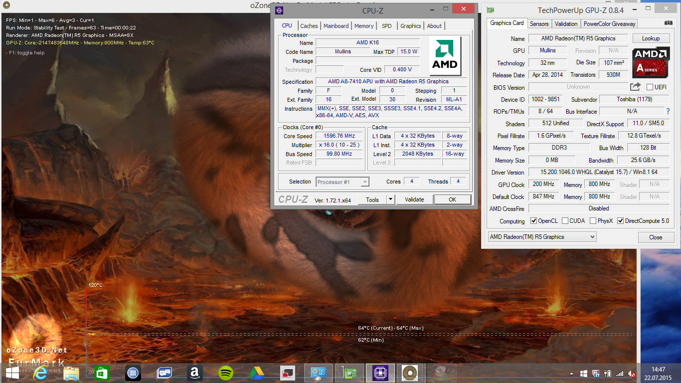 Den Stresstest (Prime95 & Furmark 1h) durchläuft das C55D im Netzbetrieb wie folgt. Gleich zu Beginn liegen 1,6 GHz an der CPU an, der A8-7410 geht also abermals sofort ins Throttling. 64 Grad Celsius an der APU sind dabei kein bedrohliches Szenario, daran kann die Drosselung nicht liegen. Die Radeon rechnet während dessen konstant mit 800 MHz, sie erfährt keine Drosselung.