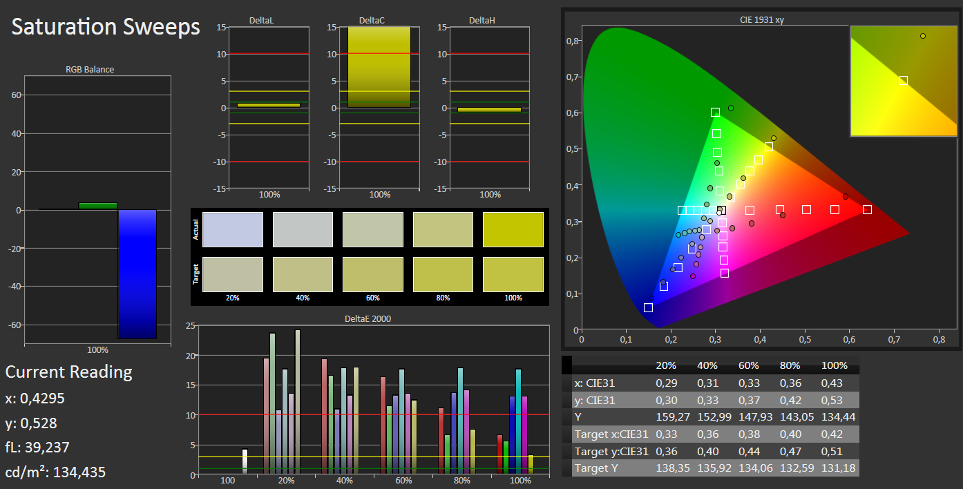 Auch die Farbdarstellung lässt zu wünschen übrig. Das Display besitzt einen sehr starken Blaustich. Die durchschnittliche DeltaE-2000-Abweichung liegt bei 13,6 und das maximale DeltaE ist 22,06. Wünschenswert wäre ein Wert von 3 oder kleiner. Alle Werte darüber zeigen eine sehr ausgeprägte Farbverfälschung. Für den absoluten Niedrigpreissektor ist das akzeptabel, für den Preis dieses Gerätes aber nicht mehr tolerierbar. Bis auf das wesentlich günstigere HP Pavilion schlagen sich hier alle anderen Vergleichsgeräte wesentlich besser.