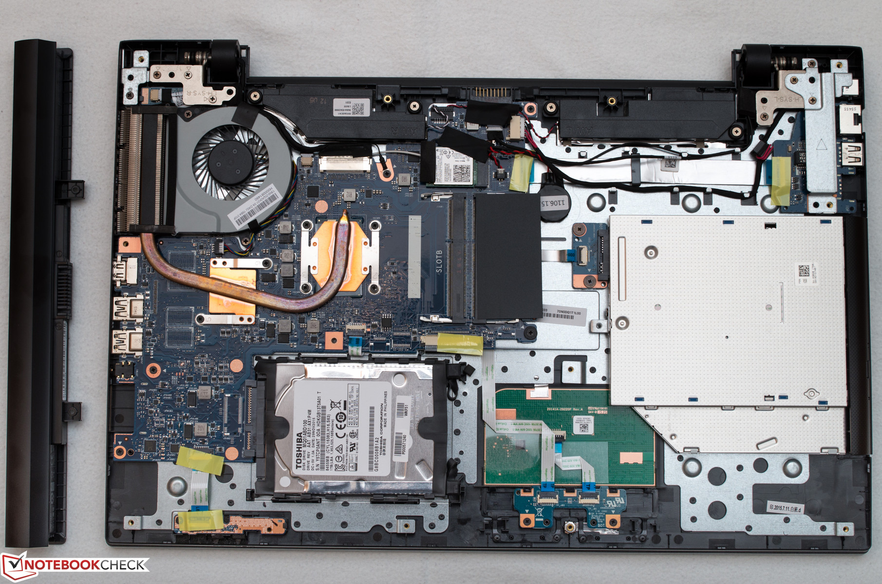 Die Spaltmaße sind groß und etwas anfällig für Staub. Jedoch lässt sich das Gehäuse auch ohne Wartungsklappen gut öffnen. Ein zweiter RAM Slot ist noch frei, ansonsten sind keine freien Ports verfügbar. Der Akku lässt sich durch das Lösen zweier Schrauben problemlos entfernen.