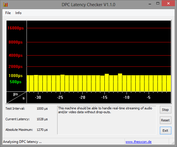 Im Stresstest werden Prozessor und Grafikkarte über eine Stunde voll ausgelastet und damit das Kühlsystem auf die Probe gestellt. Hier leistet sich das C855 keine Fehler und kann den Prozessortakt konstant auf dem maximal Möglichen von 3,0 GHz halten. Auch der Takt der GPU ist konstant bei 450 MHz. Der Prozessor erwärmt sich dabei auf vergleichsweise kühle 78 °C. Ein anschließender Durchlauf des Benchmarks 3DMark ergibt daher eine ebenso hohe Punktzahl wie auch aus dem Kaltstart.