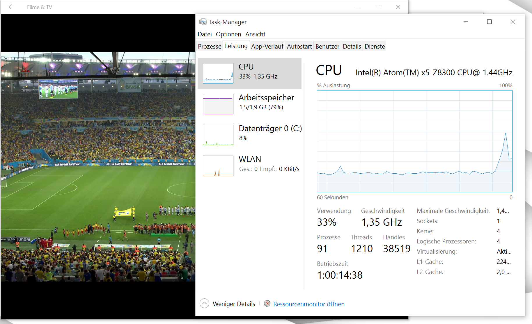 Der Cherry-Trail-Prozessor bietet gegenüber seinem Vorgänger kein wirkliches Leistungsplus. Auf Seiten der Grafikkerne sieht es hingegen anders aus. Die HD Graphics (Cherry Trail) GPU bietet gut 80 Prozent Mehrleistung gegenüber ihrem gleichnamigen Bay-Trail-Vorgänger. Die Cherry-Trail-Grafikkerne basieren auf der gleichen Architektur wie die Grafikkerne der Broadwell Prozessoren von Intel. Die Bay-Trail-GPUs entstammen noch der Ivy-Bridge-Architektur. Der hier verbaute Grafikkern unterstützt DirectX 12 und arbeitet mit Geschwindigkeiten bis zu 500 MHz. Die GPU unterstützt darüber hinaus die Wiedergabe von 4K-Material und die Dekodierung von H.265-Videos. Wir haben dies mittels der Wiedergabe eines H.265-kodierten 4k-Videos getestet. Das Video wird mit der Filme & TV App von Windows 10 problemlos abgespielt. Die CPU-Auslastung bewegt sich um 20 Prozent herum. Der Windows Media Player kann das Video hingegen nicht ruckelfrei abspielen.
