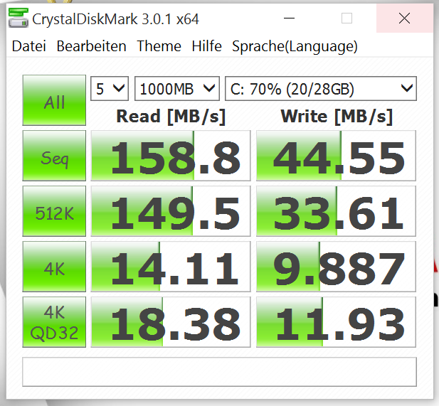 Als Systemlaufwerk dient ein eMMC-Speichermodul, das eine Gesamtkapazität von 32 GB bietet. Davon kann der Besitzer des Geräts etwa 16 GB nutzen. Der restliche Speicherplatz wird von der Windows Installation und der Recovery Partition belegt. Die Transferraten des Speichermoduls bewegen sich auf einem normalen Niveau für eMMC-Speicher. Etwas höhere Transfergeschwindigkeiten werden erreicht, wenn die ab Werk aktivierte Laufwerksverschlüsselung (Bit Locker) ausgeschaltet wird. Zur Erweiterung des Speicherplatzes steht ein MicroSD-Speicherkartenleser zur Verfügung.