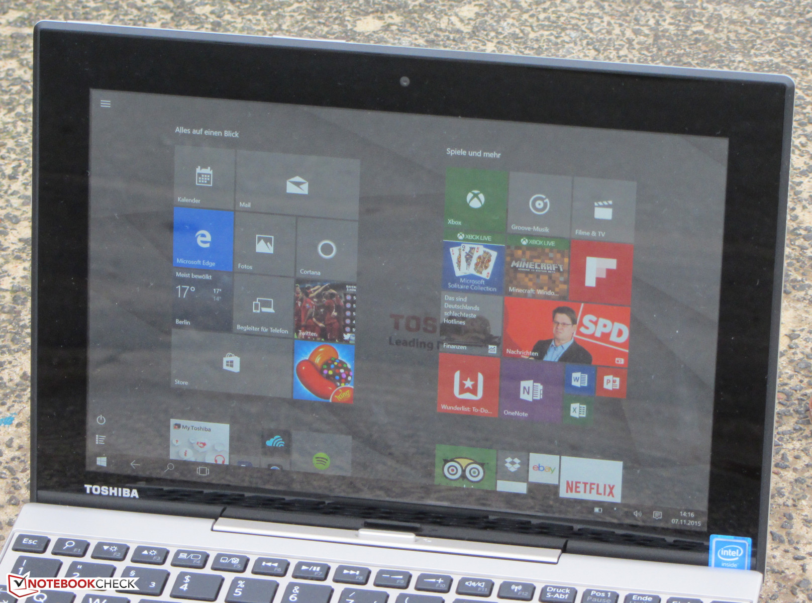 Toshiba hat das Click 10 mit einem IPS-Panel bestückt, somit ist der Bildschirm aus jeder Position heraus ablesbar. Im Akkubetrieb sinkt die Helligkeit des Bildschirms ab (249 cd/m² in der Mitte). In Kombination mit der spiegelnden Displayoberfläche ist ein Einsatz im Freien allenfalls in schattigen Umgebungen bzw. bei Bewölkung möglich.