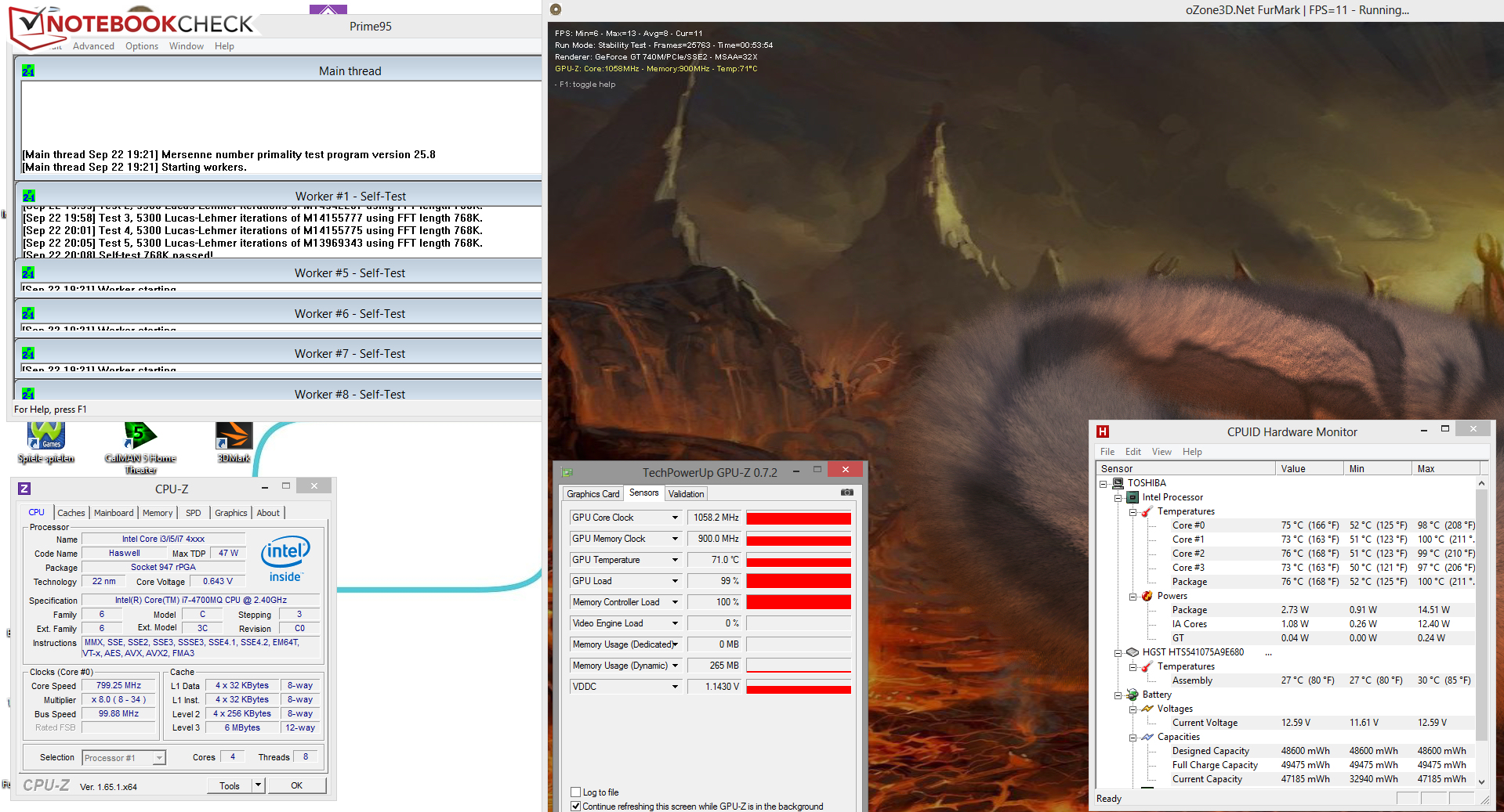 Unseren Stresstest durchläuft der Prozessor im Netzbetrieb mit 2,8 bis 3,2 GHz. Immer wieder werden alle vier Kerne schlagartig auf 800 MHz abgebremst. Dies geschieht, sobald der Prozessor eine Temperatur von 100 Grad Celsius erreicht hat. An diese Schwelle gelangt die CPU schnell, wenn sie mit den genannten Geschwindigkeiten arbeitet. Im Akkubetrieb verläuft es genauso. Allerdings erreicht die CPU nur Geschwindigkeiten von 2,8 bis 2,9 GHz. Somit dauert es etwas länger bis die Einhundert-Grad-Celsius-Grenze erreicht ist. Der Grafikkern durchläuft den Stresstest sowohl im Netz- als auch im Akkubetrieb stets mit voller Turbogeschwindigkeit (1.058 MHz).