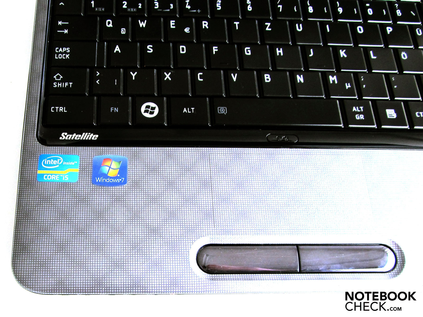 Das Touchpad befindet sich wie gewohnt vor der Tastatur, ist aber durch die ungewöhnlich kleinen Abmessungen und die Integration in die Handballenauflage anfänglich kaum auszumachen. Das Muster der Handballenauflage verläuft durchgängig über das Touchpad und es bedarf daher viel Übung, um das leicht erhabene Feld gezielt zu treffen. Vor dem Touchpad befinden sich zwei riesig wirkende Maustasten. Über dem Touchpad hat Toshiba diesem einen Ausschalter spendiert.