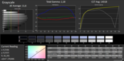 Als Consumer-Notebook bleibt der Farbraum des L855-15U, wie zu erwarten, weit hinter sRGB zurück und ist für professionelle Bildbearbeitung nicht ausreichend. Vor der Kalibrierung haben wir die Anzeige mit CalMAN-Farbanalyse und i1 Pro 2 Fotospektrometer vermessen (Zielfarbraum sRGB). Sehr deutlich wird eine Schwäche bei der Darstellung von Grautönen. Insbesondere mittlere Töne zeigen ein DeltaE(2000) von mehr als 15 (Durchschnitt 11,6). Auch die Farben unseres Testgeräts sind nach blau verschoben.