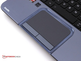 Das Touchpad ist nach links versetzt und durch ein extra Inlay optisch dekorativ zur Handballenauflage abgegrenzt. Es erkennt Multitouchgesten und ist 9,6 x 5,6 cm groß. Die glatte Oberfläche macht die Bedienung angenehm. Die beiden großen Tasten sind baulich von einander getrennt und haben einen kurzen Hub. Das akustische Feedback nach Tastendruck ist dabei allerdings relativ laut.