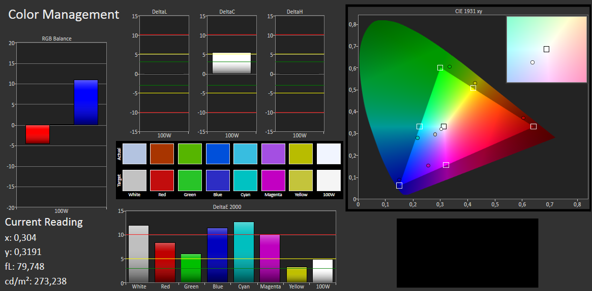 Unten sehen Sie die Screenshots, die wir von der Farbanalyse durch i1 Pro 2 Fotospektrometer und CalMAN 5 Software gemacht haben. Dabei zeigt sich, dass das Display des Toshiba Satellite L855D-10K in den Werkseinstellungen nicht sonderlich farbtreu ist. Außerdem zeigt sich der oft beobachtete Blaustich auch bei diesem Display. Grauwerte entsprechen kaum ihrem angedachten Wert, lediglich volles Schwarz und Weiß liegen hier innerhalb einer tolerierbaren Abweichung.