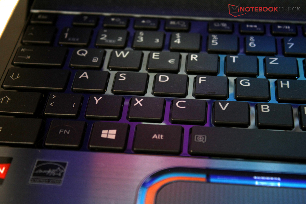 102 Tasten umfasst die mattschwarze Tastatur mit separatem Nummernblock. Einen solchen gibt es nicht bei allen 15,6-Zoll-Multimediabooks: das Dell Inspiron 15R SE muss beispielsweise ohne auskommen. Toshiba verspricht im Marketingtext des Satellite L855D-10K einen klar definierten Druckpunkt. Tatsächlich ist aber nicht immer ganz klar, ob das System die Eingabe wirklich angenommen hat – besonders, wenn der Finger die Tasten leicht seitlich erwischt. Der sehr kurze Hub und das harte Anschlagverhalten sind Geschmackssache, allerdings gibt die Tastatur über die ganze Fläche auf Druck spürbar nach, was den Qualitätseindruck schmälert.
