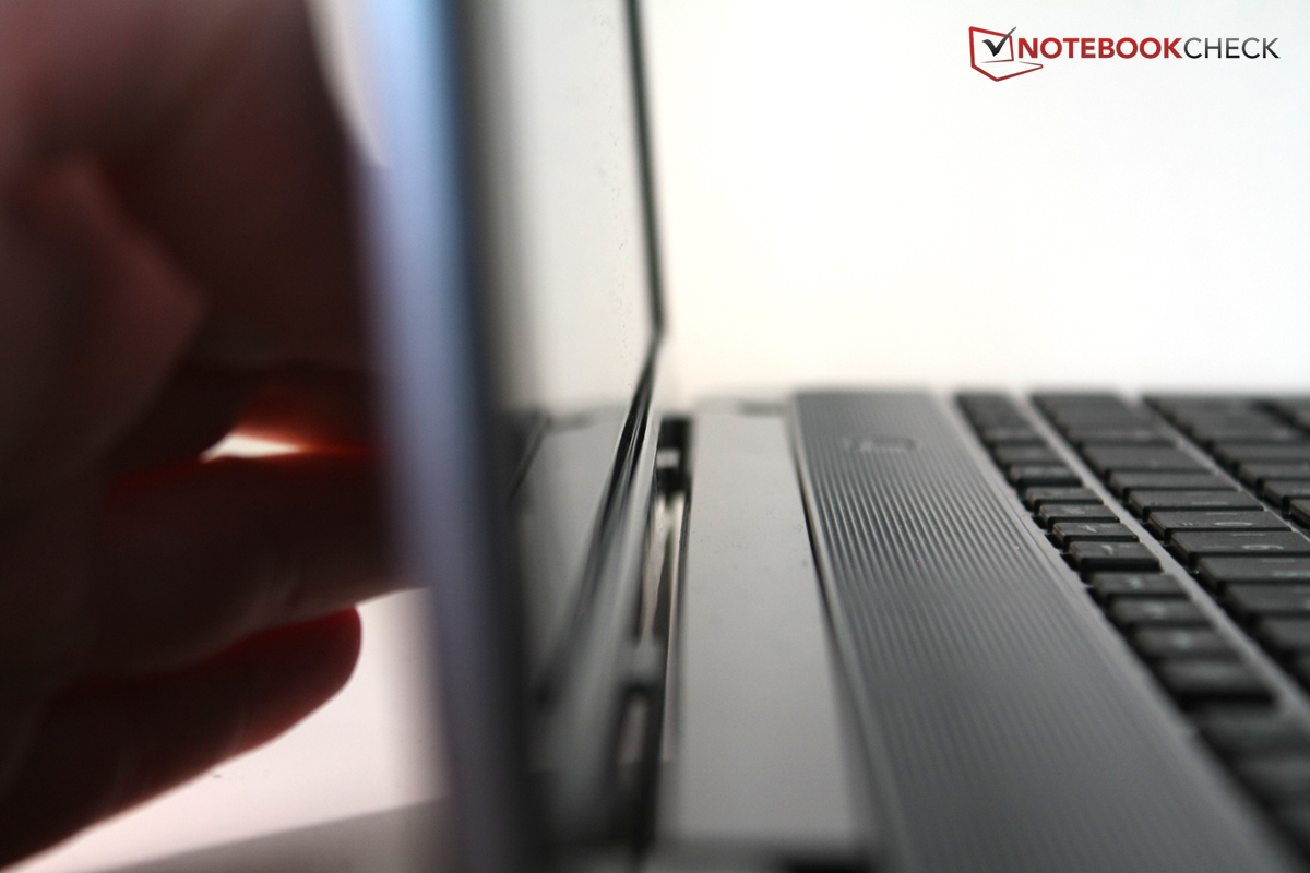 Auf den ersten Blick begeistert das Toshiba Satellite L855D-10K mit seiner ungewöhnlichen, von Toshiba "Eisblau" genannten Farbe und dem gebürsteten Aluminium, das sich über den Deckel zieht. Schon bei der ersten Berührung wird aber klar, dass es mit der Stabilität des Gehäuses nicht weit her ist: Selbst wenn man leicht über den Deckel streicht, biegt sich dieser deutlich nach innen. Wird der Deckel geöffnet, lässt sich dieser sehr leicht verwinden, was sich auch auf dem Display durch Helligkeitsänderungen bemerkbar macht. Außerdem wölbt sich die Umrandung des Bildschirms aus glänzendem Kunststoff dabei deutlich nach vorne, so dass ein Spalt zwischen Aluminium und Kunststoff entsteht.