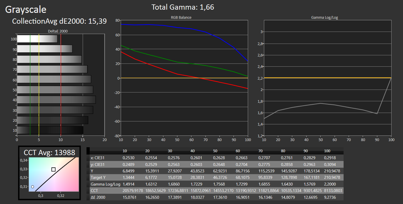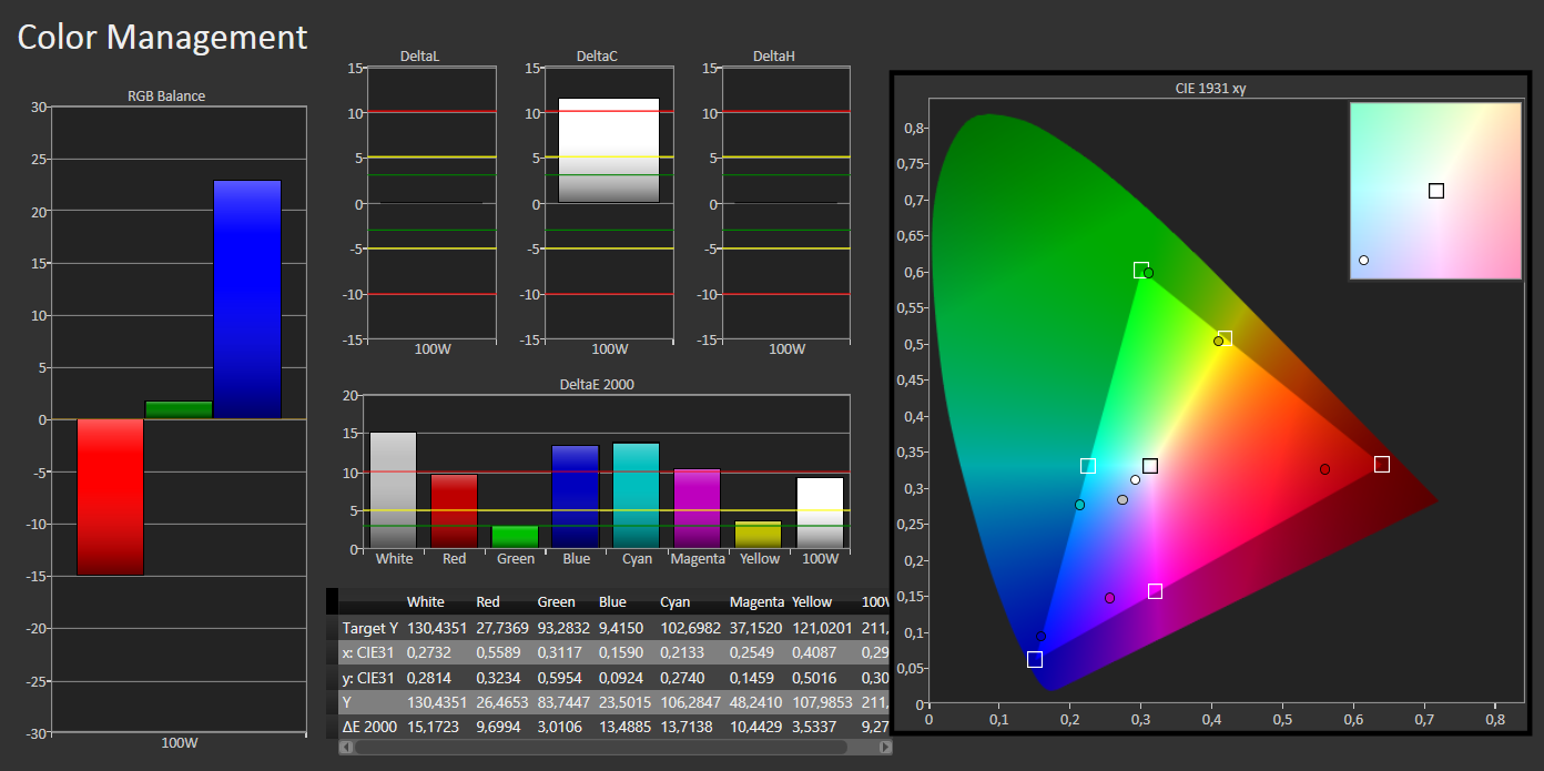 Vor der Kalibrierung des Bildschirms (Auslieferungszustand) haben wir diesen vermessen. Dabei konnten wir starke DeltaE-2000-Abweichungen bei Blau, Cyan, Weiß und Graustufen ausmachen.