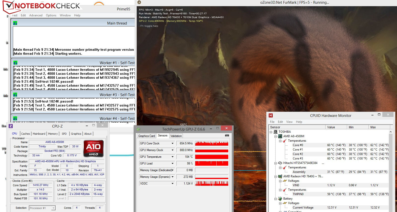 Den Stresstest (Prime 95 und Furmark arbeiten mindestens eine Stunde lang) im Netzbetrieb beginnt die CPU mit stark schwankenden Geschwindigkeiten. Nach wenigen Minuten pendelt sich die Geschwindigkeit grob bei 1,4 GHz ein. Es treten aber immer wieder Ausschläge nach oben (bis zu 2,3 GHz) und nach unten (bis zu 900 MHz) auf. Mit fortschreitender Dauer werden die Auschläge seltener. Die GPU arbeitet im Netzbetrieb überwiegend mit einer Geschwindigkeit von 497 MHz. Immer wieder wird die GPU kurzzeitig auf 655 MHz beschleunigt. Ganz selten wird die Geschwindigkeit auf 335 MHz abgebremst. Wird der Stresstest im Akkubetrieb durchgeführt, geht die CPU konstant mit 1,9 GHz und die GPU konstant mit 335 MHz zu Werke. Direkt nach dem Stresstest im Netzbetrieb haben wir den 3D Mark 2006 Benchmark erneut ausgeführt. Das Ergebnis hat sich gegenüber dem kühlen Notebookzustand nicht geändert. Die CPU Temperatur hat sich im Netzbetrieb bei 60 Grad Celsius eingependelt.