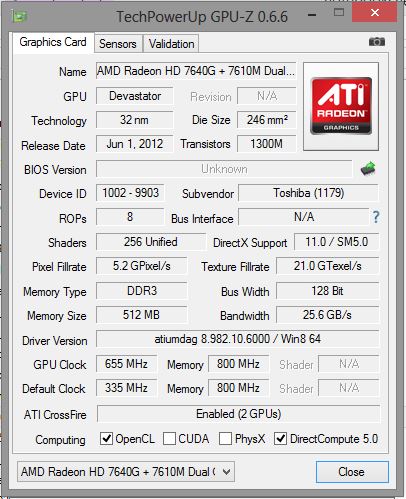 Toshiba setzt auf eine Dualgrafiklösung, d.h. zwei Grafikkerne arbeiten an der Berechnung der dargestellten Bilder. Da wäre zum einen, die in die APU integrierte Radeon HD 7640G-GPU (Einsteigerklasse), und zum anderen die dedizierte Radeon HD 7610M-GPU (untere GPU-Mittelklasse). Beide GPUs unterstützen DirectX 11. Mehr Informationen zu der Dualgrafiklösung finden sich im zugehörigen Datenblatt.