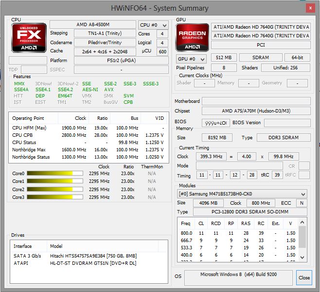 Im Inneren des Toshiba Rechners werkelt eine A8-4500M APU der Firma AMD. Hierbei handelt es sich um einen Abkömmling der Trinity-Generation. Der CPU-Teil der APU besteht aus einem Vierkernprozessor, der mit einer Basisgeschwindigkeit von 1,9 GHz arbeitet. Mittels Turbo kann die Geschwindigkeit auf bis zu 2,8 GHz gesteigert werden.