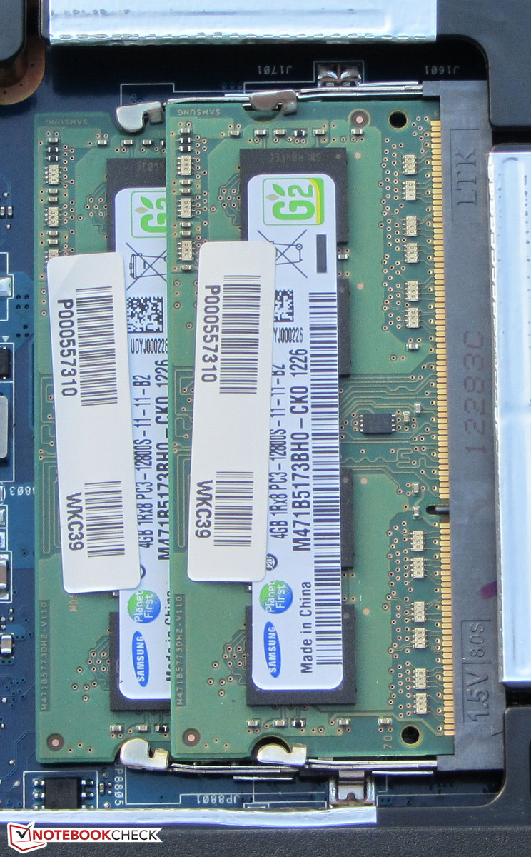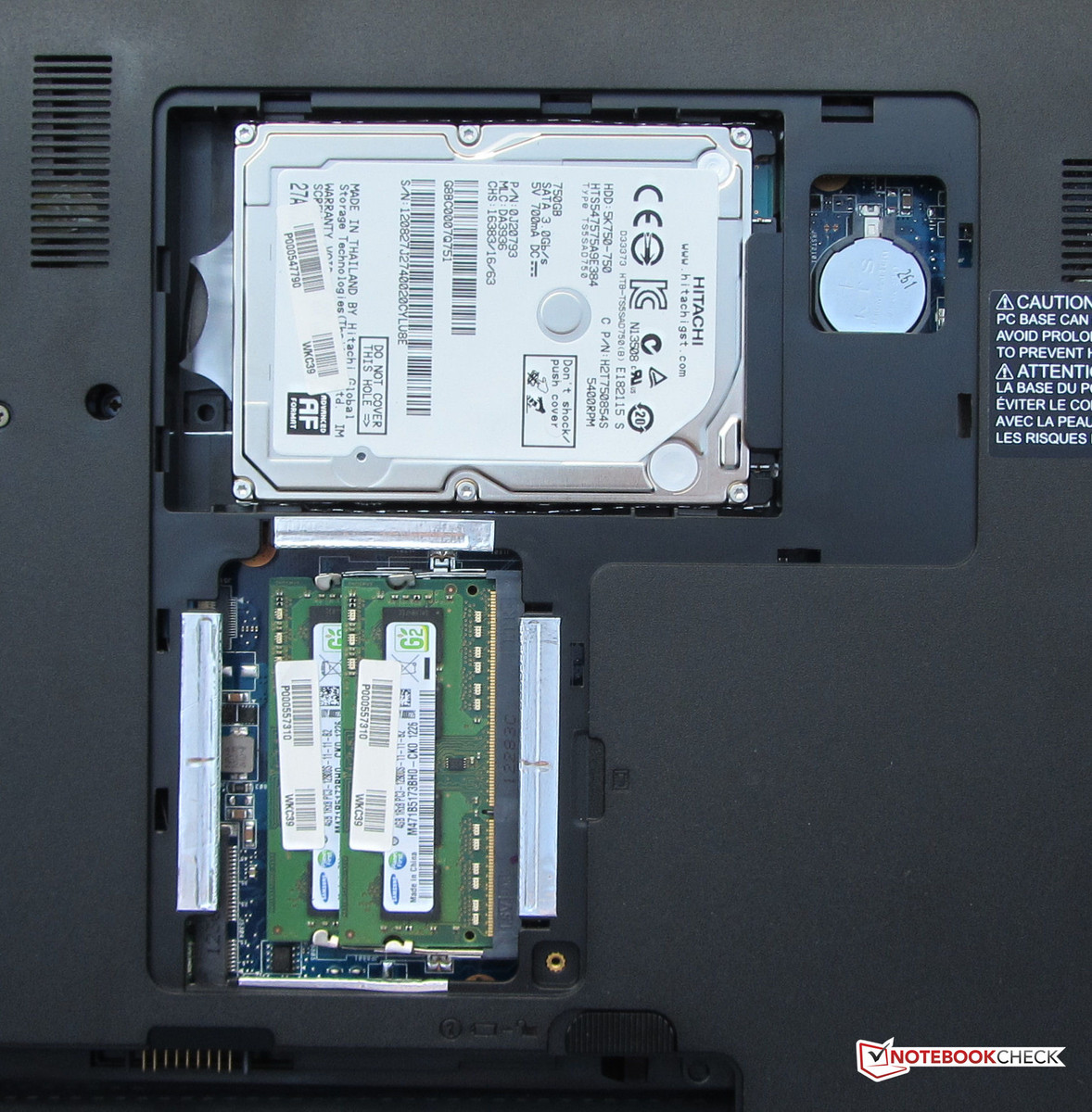 Hinter der Wartungklappe des Satellite verbergen sich der Arbeitsspeicher, die Festplatte und die BIOS-Batterie. Zugriff auf den Lüfter hat man nicht. Das Satellite ist mit zwei Arbeitsspeicherbänken ausgestattet. Beide sind mit jeweils einem vier-Gigabyte-Modul belegt. Insgesamt kann das Notebook auf bis zu 16 GB Arbeitsspeicher ausgebaut werden. Die Festplatte ließe sich leicht tauschen. Einfach die Platte herausziehen, den Rahmen abmontieren, diesen an die neue Festplatte schrauben und diese in das Notebook stecken. Fertig.