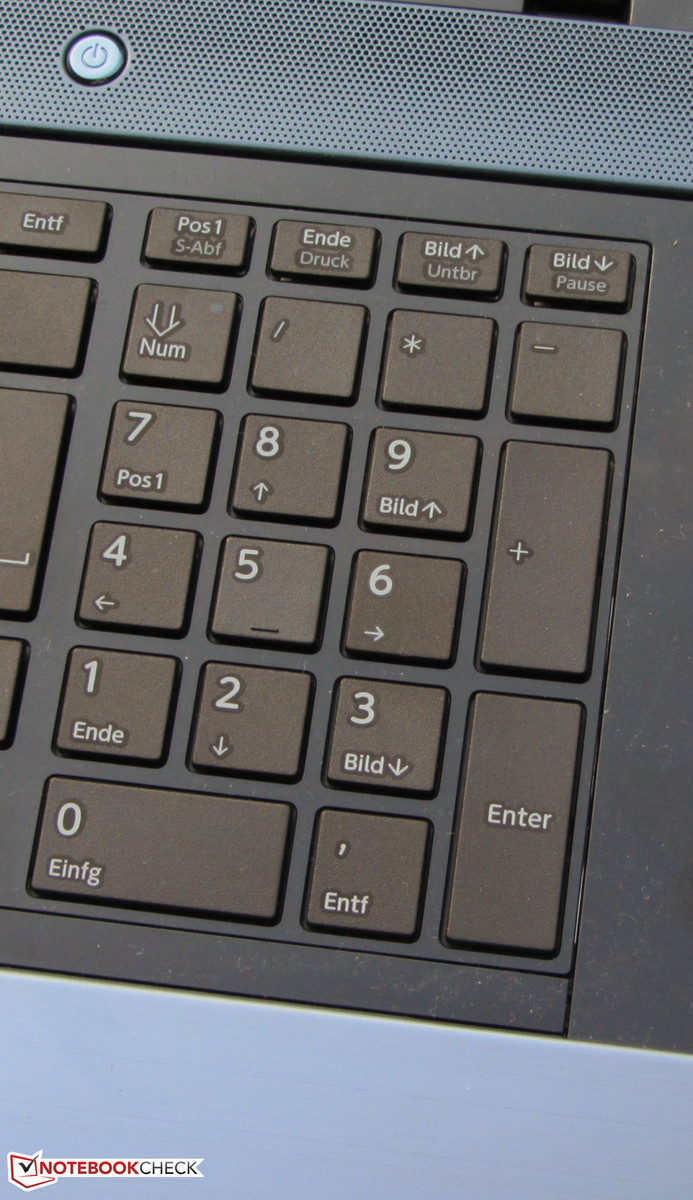 Toshiba verbaut im L875D eine unbeleuchtete Chiclet-Tastatur samt Nummernblock. Die Haupttasten haben die Ausmaße 15 x 15 mm und besitzen einen mittleren Hub. Die Tasten dürften insgesamt über einen strafferen Widerstand verfügen und auch der Anschlag dürfte klarer ausfallen. Die Tastatur sitzt recht fest im Gehäuse und wippt wärend des Tippens nur leicht. Für Vieltipper ist die Tastatur nicht die erste Wahl, für den Hausgebrauch reicht sie aber aus. Leider sind die Pfeiltasten und die Enter-Taste ohne Not etwas klein ausgefallen. Genug Platz wäre vorhanden.