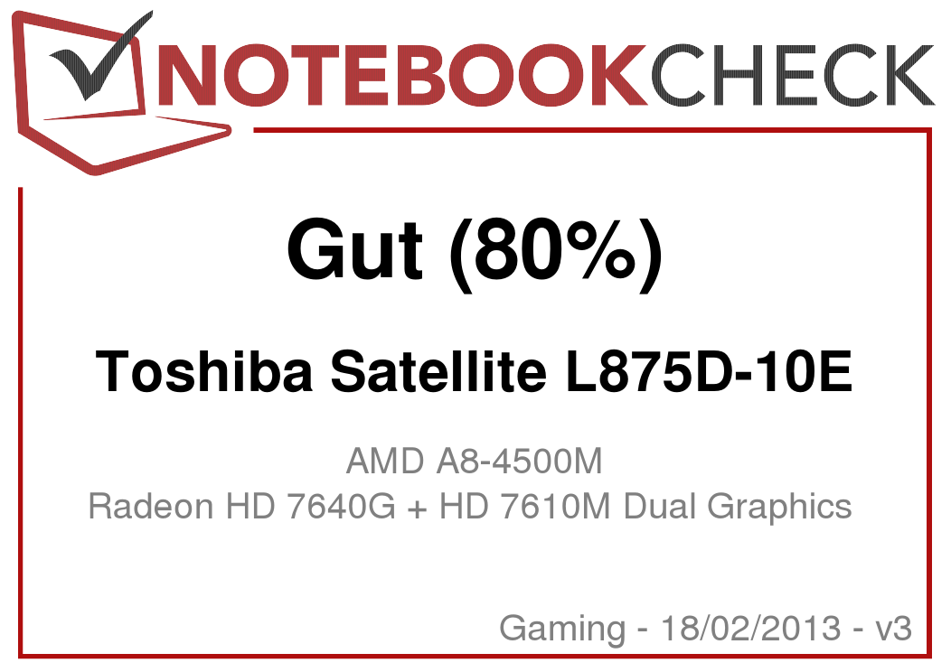 Toshiba hat mit dem Satellite L875D ein 17,3-Zoll-Notebook im Angebot, das Alltagsaufgaben wie das Surfen im Internet, Office-Arbeiten, Internettelefonie, Videowiedergabe keine großen Herausforderungen darstellen. Auch aktuelle 3D-Spiele können dank der Dualgrafiklösung mit dem Rechner gespielt werden. Das Notebook ist für etwa 600 bis 700 Euro zu haben. Andere Ausstattungsvarianten des L875D konnten wir nicht ausmachen. Unter der Bezeichnung Satellite L870 hat Toshiba eine baugleiche Parallelserie im Angebot, die mit Intel-Prozessoren und Radeon HD 7670M-GPU bestückt sind (Preis: etwa 750 bis 900 Euro).