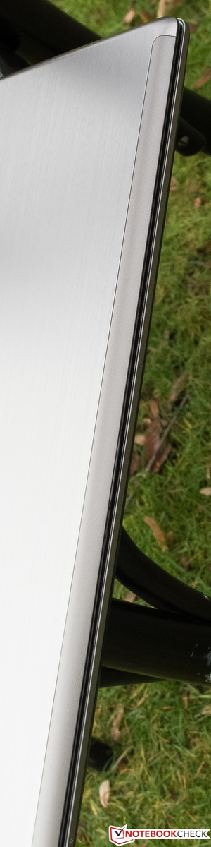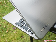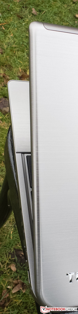 Deckelrückseite und Handballenablage sind in gebürstetem Aluminium gehalten, während das Tastaturbett und die Fläche zwischen Bildschirm und Tastatur den gleichen Farbton haben, aber eine einfache matte Oberfläche aufweisen. Die einzigen schwarzen Elemente aus Kunststoff sind der glänzende Bildschirmrahmen mit Scharnieren und die Unterseite der Base, die für bessere Griffigkeit geriffelt ist. Bei schrägen Einblickwinkeln sind schon nach kurzer Nutzung überall auf dem Gerät Fingerabdrücke zu sehen.