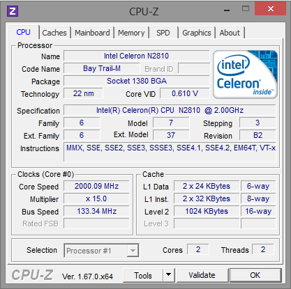 Toshiba hat das kleine Satellite mit einem Intel Celeron N2810 Zweikernprozessor ausgestattet. Er basiert auf der Silvermont Architektur der neuen Bay-Trail-M-Plattform - genauso wie Intels aktuelle Atom-Prozessoren. Der Celeron arbeitet mit einer Geschwindigkeit von 2 GHz. Einen Turbo gibt es nicht. Intel beziffert die TDP mit 7,5 Watt. Damit liegt der Energiebedarf ziemlich deutlich unterhalb der ULV-CPU bzw. ULV-APU des Aspire bzw. des Thinkpad Edge.