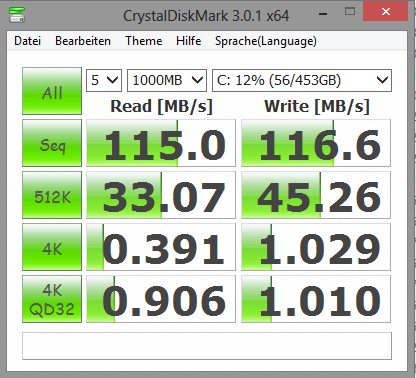 In dem Satellite steckt eine Festplatte von Toshiba. Sie besitzt eine Kapazität von 500 GB und arbeitet mit 5.400 Umdrehungen pro Minute. CrystalDiskMark meldet eine Lesegeschwindigkeit von 115 MB/s. HD Tune liefert eine durchschnittliche Transferrate von 87,8 MB/s. Hierbei handelt es sich um gute Werte für eine 5.400er-Festplatte, die wir bei einem Netbook nicht erwartet haben.