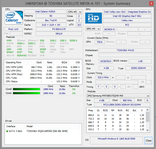 | Toshiba Satellite NB10t-A-101 HD Graphics (Bay Trail), N2810, Toshiba MQ01ABF050 | Lenovo ThinkPad Edge E145 Radeon HD 8240, E1-2500, Hitachi Travelstar Z5K500 HTS545050A7E380 | Acer Aspire V5-131-10172G50akk HD Graphics (Ivy Bridge), 1017U, Seagate Momentus Thin ST500LT0 12-9WS142 | |