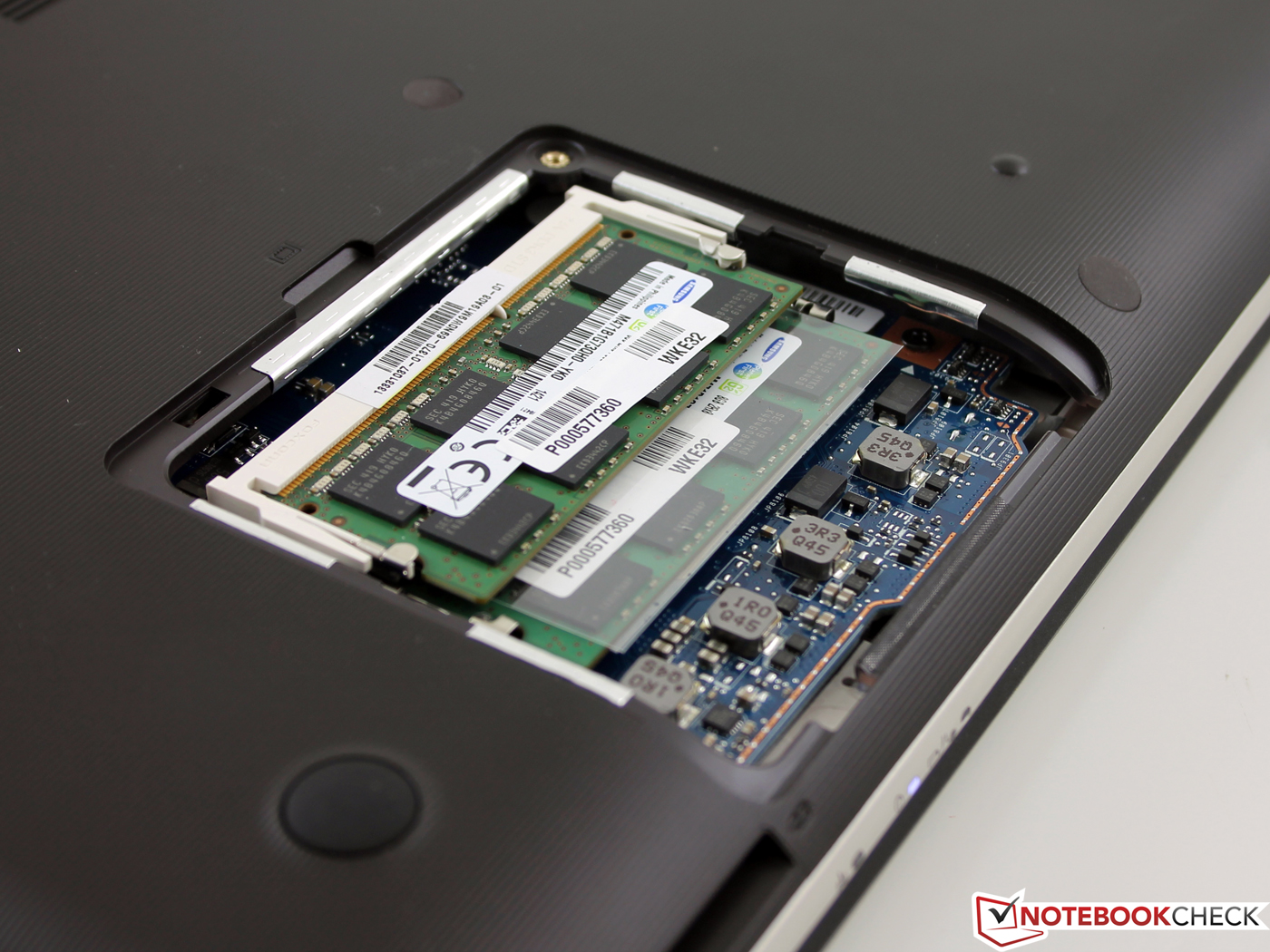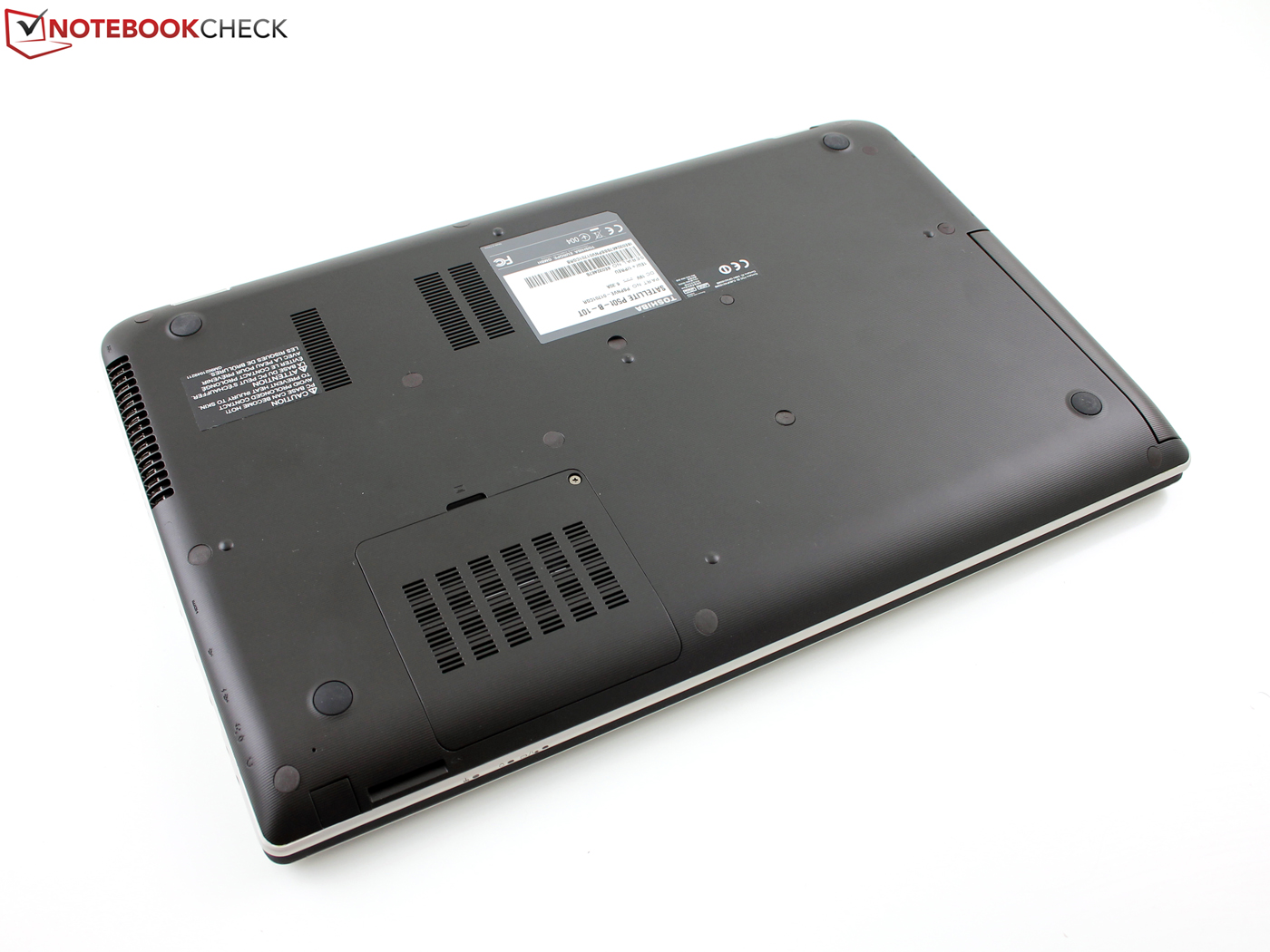 Wartung wird beim Satellite klein geschrieben. Der "verplombte" Akku grenzt schon an Dreistigkeit, diese Praxis nimmt aber auch bei anderen Herstellern zu und beschränkt sich nicht nur auf besonders flache Geräte. Einzig für den Arbeitsspeicher sieht der Hersteller eine kleine Wartungsklappe vor. Unter zahlreichen Gummiabdeckungen verstecken sich die Schrauben, die eine Demontage der Bodenplatte ermöglichen. Um Beschädigungen des Shop-Gerätes zu vermeiden, haben wir auf eine Öffnung verzichtet. Wir gehen von einem sehr ähnlichen Innen-Layout wie beim Satellite P50-A-11L aus, wir verweisen auf diesen Test für Fotos des Innenraums.