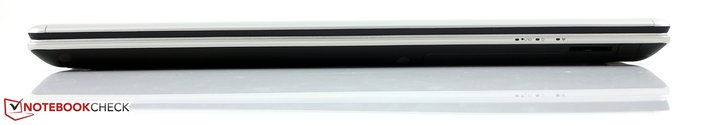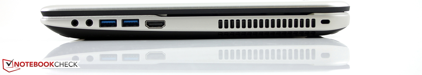 Die Anordnung von HDMI, USB-3.0-Schnittstellen sowie Mikrofon-/Kopfhörer-Buchse auf der rechten, vorderen Seite sorgt für reichlich Kabelgewirr. Aufgrund der Display-Aufhängung ist die Rückseite für Anschlüsse konstruktiv verwehrt. Andere Hersteller zeigen, dass es auch anders geht, siehe z. B. Acer Aspire V5-573G, bei welchem fast alle Ports auf der Rückseite verschwinden, was auf dem aufgeräumten Schreibtisch einen angenehmen Effekt hat.