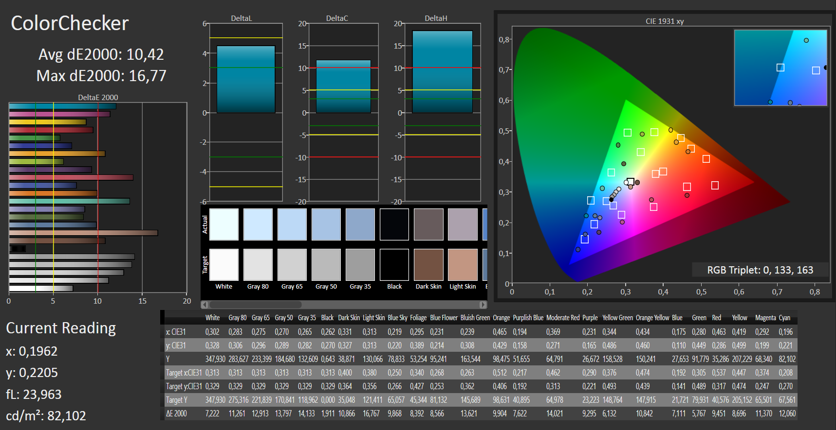 Die Farbdarstellung des Bildschirms kann im Auslieferungszustand nicht überzeugen. Er zeigt eine durchschnittliche DeltaE-2000-Abweichung von 10,42. Anzustreben wäre ein Wert kleiner 3. Darüber hinaus besitzt das Display einen Blaustich.