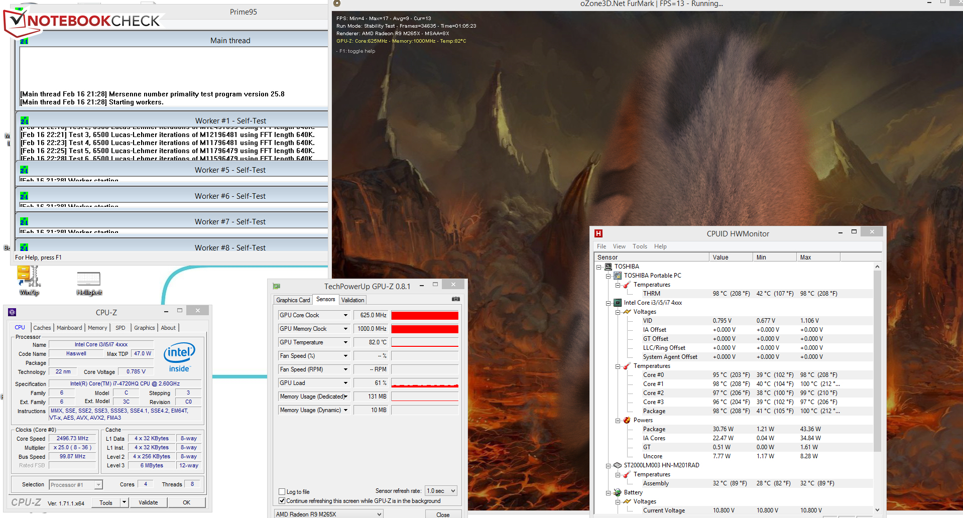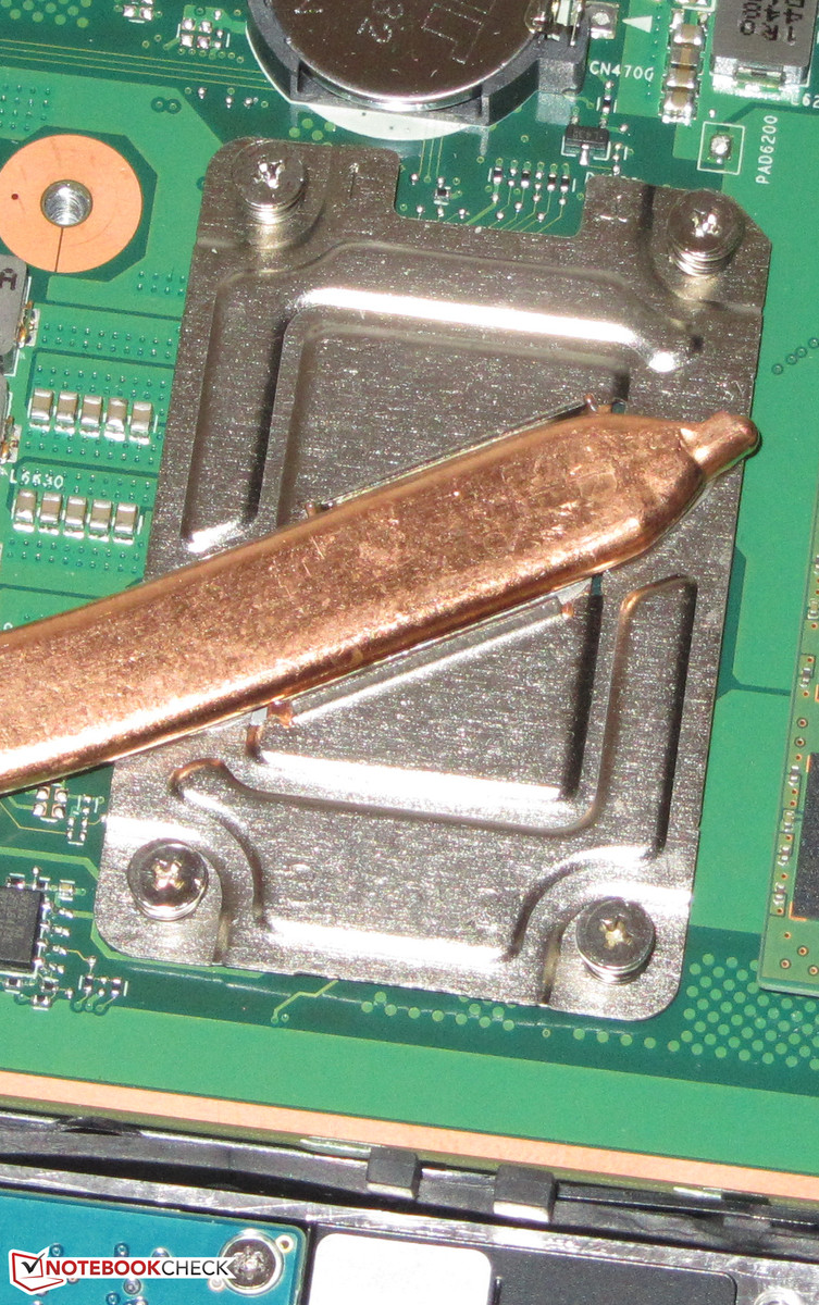Den Stresstest (Prime95 und Furmark laufen für mindestens eine Stunde) durchläuft das Satellite im Netz- und im Akkubetrieb auf unterschiedliche Weisen. Der Prozessor werkelt mit 2,3 bis 2,6 GHz (Netzbetrieb) bzw. 2,6 GHz (Akkubetrieb). Der Grafikkern arbeitet im Netzbetrieb mit voller Geschwindigkeit (625 MHz). Im Akkubetrieb wird er auf 400 MHz gedrosselt. Die Erwärmung des Notebooks fällt überwiegend moderat aus. Lediglich im Bereich des Kühlsystems wird es sehr heiß (Werte über 50 Grad Celsius). Das Asus N751JK-T4144H und das HP Envy 17-k104ng erwärmen sich während des Stresstests nicht so stark wie das Satellite. Beim Asus Rechner ist Throttling die Ursache. Das Envy profitiert von seinem ULV-Prozessor und dem sehr stark aufdrehenden Lüfter.