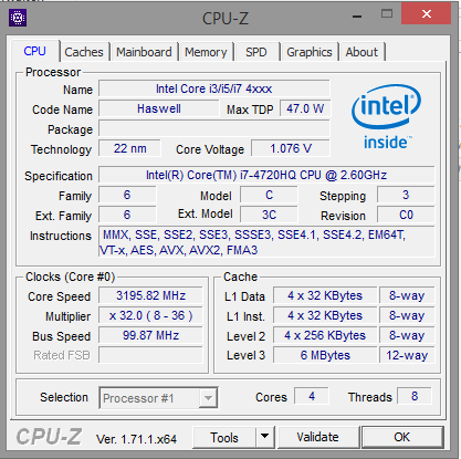 Toshiba hat im Satellite Intels Core i7-4720HQ Vierkernprozessor (Haswell) verbaut. Der Prozessor arbeitet mit einer Basisgeschwindigkeit von 2,6 GHz. Mittels Turbo kann die Geschwindigkeit auf 3,4 GHz (alle vier Kerne), 3,5 GHz (zwei Kerne) bzw. 3,6 GHz (nur ein Kern) beschleunigt werden. Der Turbo wird aber nicht voll ausgenutzt. Die Single-Thread-Tests der Cinebench Benchmarks begeht die CPU mit 2,9 bis 3,6 GHz. Die Multi-Thread-Tests werden mit konstanten 2,9 GHz bearbeitet. Somit bleibt der Prozessor bei Multi-Thread-Anwendungen hinter seinen Möglichkeiten zurück. Im Akkubetrieb werden alle CPU-Tests mit der Basisgeschwindigkeit (2,6 GHz) bearbeitet.