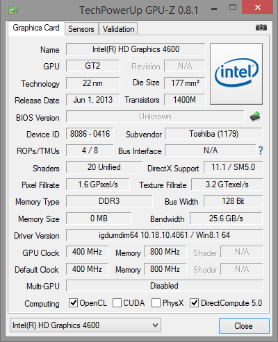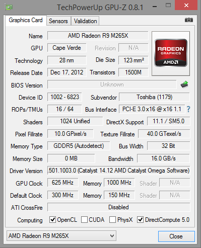 Toshiba setzt beim Satellite auf eine Umschaltgrafiklösung (Enduro). Im Alltags- und Akkubetrieb kommt Intels HD Graphics 4600 GPU zum Einsatz. Leistungsfordernde Anwendungen wie Computerspiele bearbeitet AMDs Radeon R9 M265X Grafikkern. Die Umschaltung zwischen beiden Kernen erfolgt in der Regel automatisch. Allerdings funktioniert es nicht ganz so reibungslos wie bei Nvidias Gegenstück (Optimus Technologie). Der Nutzer muss gelegentlich manuell nachjustieren. Die Radeon GPU gehört zur oberen Mittelklasse unter den Grafikkernen. Sie unterstützt DirectX 11.2 und arbeitet mit Geschwindigkeiten bis zu 625 MHz. Die Resultate in den 3D Mark Benchmarks ordnen den Grafikkern oberhalb von Nvidias GeForce 840M GPU, aber noch deutlich unter dem GeForce GTX 850M Kern ein.