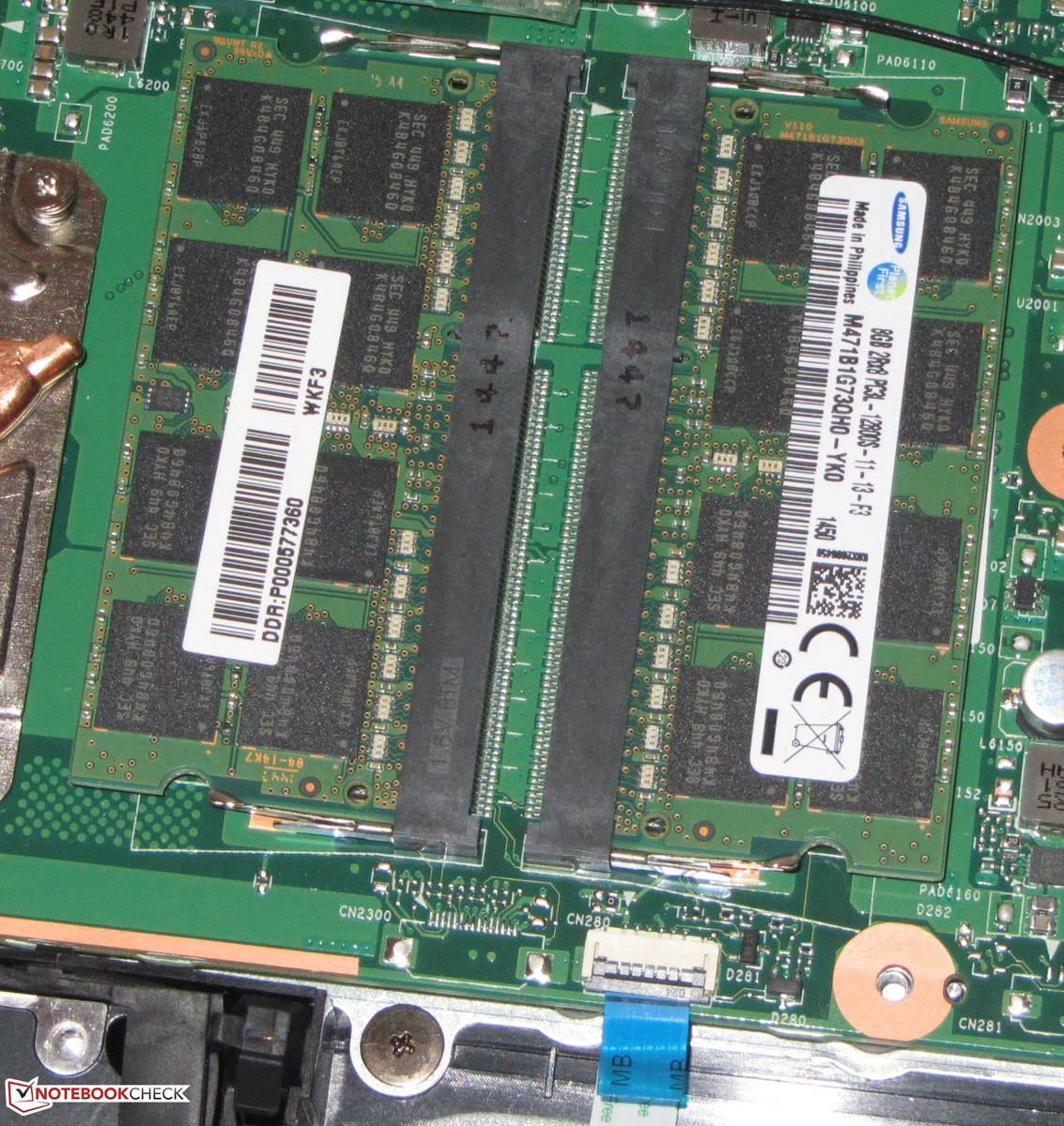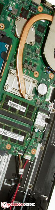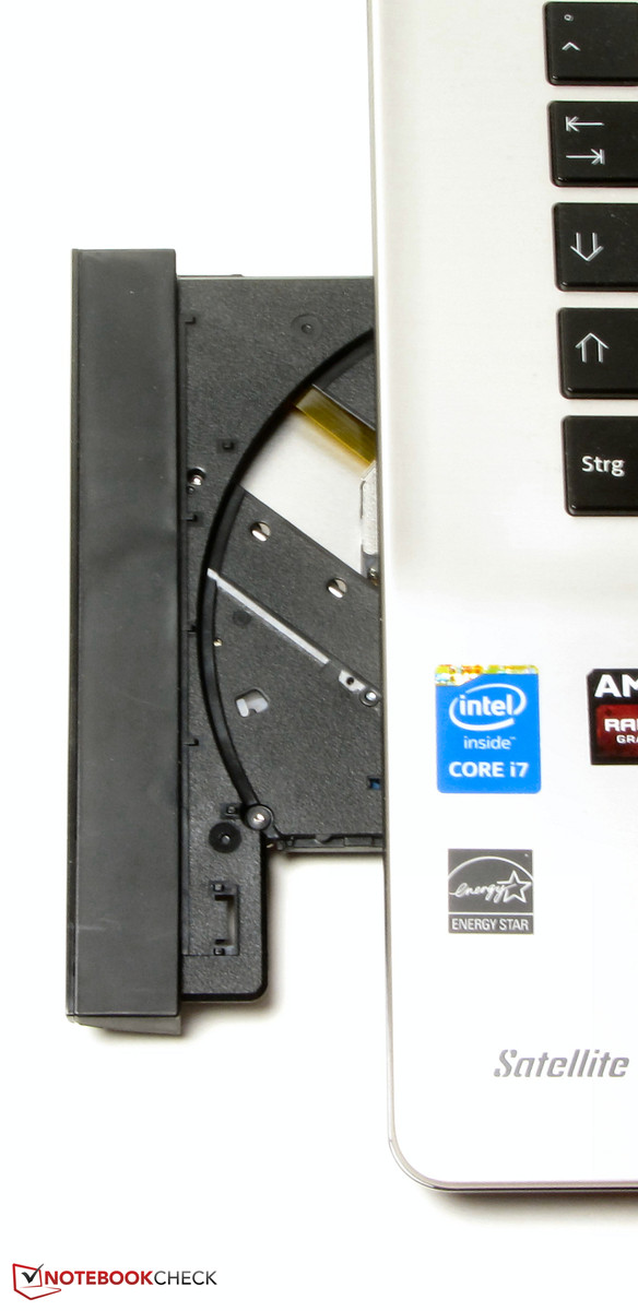 Trotz dem Fehlen einer Wartungsklappe gelangt man recht einfach an die Hardware des Rechners: Zuerst wird die Halteschraube des optischen Laufwerks gelöst, anschließend kann es einfach heraus gezogen werden. Nun werden alle restlichen Schrauben auf der Unterseite des Notebooks entfernt. Danach kann die Unterschale recht einfach gelöst werden. Das Satellite ist mit zwei Arbeitsspeicherbänken ausgestattet. Beide sind mit jeweils einem 8-GB-Modul belegt. Damit ist das Maximum erreicht. Ein Tausch der Festplatte ist leicht zu bewerkstelligen. Diese ist nicht verschraubt, sondern wird mit einem Gummirahmen in die Halterung geklemmt.