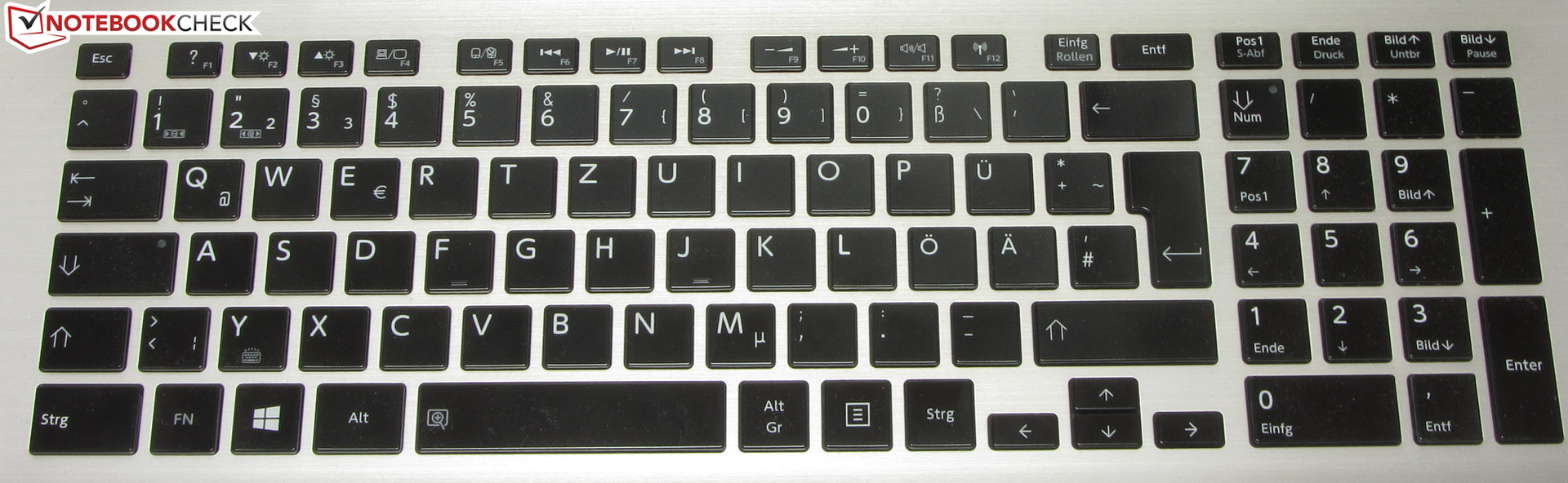 Toshiba setzt beim Satellite auf eine beleuchtete Chiclet-Tastatur. Die Haupttasten verfügen etwa über die Ausmaße 15 x 15 mm. Insgesamt besitzen die Tasten eine glatte, flache Oberfläche und einen mittleren Hub. Ihr deutlicher Druckpunkt und angenehmer Widerstand wissen zu gefallen. Auch Vielschreiber können mit der Tastatur etwas anfangen. Die Beleuchtung kann mit Hilfe einer Funktionstaste ein- bzw. ausgeschaltet werden.