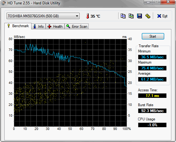 Daneben ist eine langsame Toshiba MK5076GSXN (500GB, 5400rpm) eingebaut. Deren Durchsätze haben wir nicht in die Datenbank eingetragen. Der HD Tune (61 statt 85 MB/s) fällt deutlich geringer aus als mit der Momentus XT System-Festplatte.
