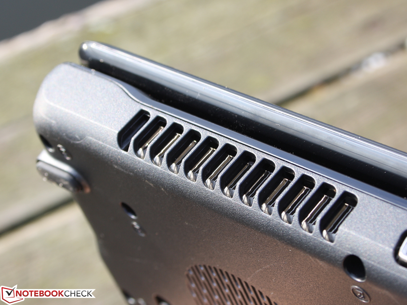 Störend empfinden wir die Position der Anschlüsse im vorderen Bereich der linken und rechten Seite. Wer HDMI, USB 3.0 (links) und zwei USB-Geräte nebst Lautsprechern (rechts) anschließt, der überlädt seinen Schreibtisch mit einem Kabelbaum zu beiden Seiten. Jetzt fehlt der Platz zur Ablage einer Maus, aber zumindest wird die Kabel-Unordnung unschön aussehen. Anschlüsse auf der Rückseite, wie in den guten alten Laptop-Tagen, gibt es auf Grund des tief hängenden Scharniers keine.