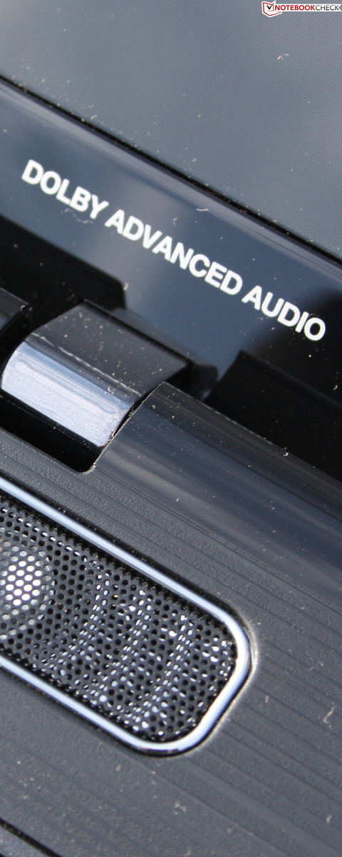 Über die Soft-Touch Leiste kann die Lautstärke einfach reguliert werden (+Stumm-Taste), hier stört lediglich der Pieps-Ton beim Tippen der Tasten. Der Dolby Audio Enhancer ist beim P770 äußerst wirkungsvoll (Eigenschaften Lautsprecher). Er verbessert die Höhen und erweitert den Bassbereich um eine Oktave. Lautsprecher oder Kopfhörer können nur per analog Klinke angeschlossen werden.