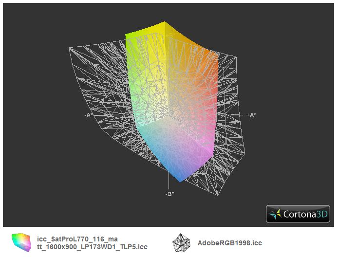 WXGA++ ist eine bürotaugliche Auflösung für einen 17-Zoller, die sich als Standard für den Formfaktor etabliert hat. Das früher übliche und im Business-Sektor beliebte 4:3 Format hat sich nicht erhalten können, da die Panel-Produktion eine Vereinheitlichung forderte. Auch wenn CPU und HDD schnell genug rechnen, für Experten der Bildbearbeitung eignet sich der L770 nicht. Der Farbraum des Panels ist gering und verfehlt sRGB (t) und AdobeRGB (t) deutlich.