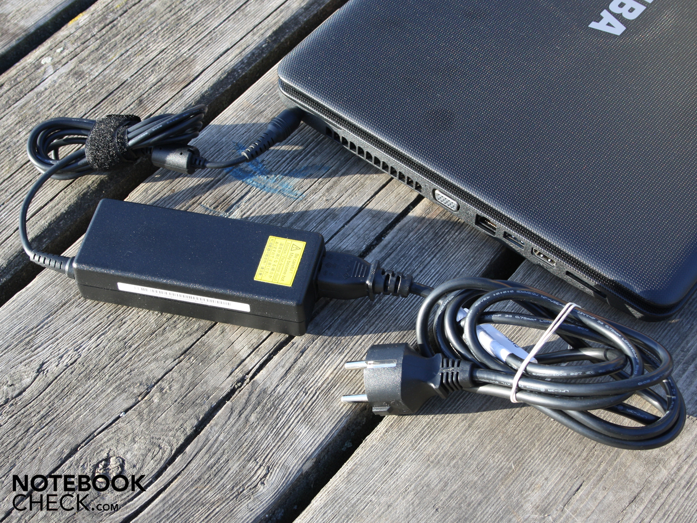Die Energieaufnahme des Satellite Pro L770 ist gering, sofern der Prozessor und/oder die Grafik nicht gefordert werden. Wenn im Leerlauf alle Sparoptionen eingestellt sind (Luminanz auf niedrigster Stufe, Funk off), dann liegt der Strombedarf bei 11.5 Watt (Idle, min.). Ein helles Display und aktive Funkmodule fordern jedoch Tribut. Hierbei und im Modus Höchstleistung messen wir 20 Watt (Idle, max.). Die höchstmögliche Energieaufnahme (ohne Akkuladung) liegt bei 59 Watt (Prime95 Solo). Das 75 Watt Netzteil (306 Gramm) wurde während der Tests höchstens 50 Grad warm.