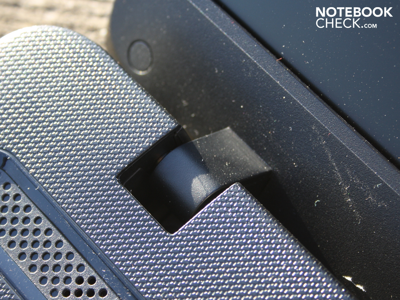 Der Deckel wird von zwei überfordert wirkenden Scharnieren in seiner Position gehalten. Eine Verriegelung gibt es nicht. Das schwere Display wippt beim Schütteln nach, was bei holperigen Autofahrten ein Problem ist. Der maximale Öffnungswinkel von zirka 140 Grad ist für den Betrieb auf dem Schoß ausreichend. Die Fläche des Deckels kann großflächig eingedrückt werden, jedoch nur um wenige Millimeter.