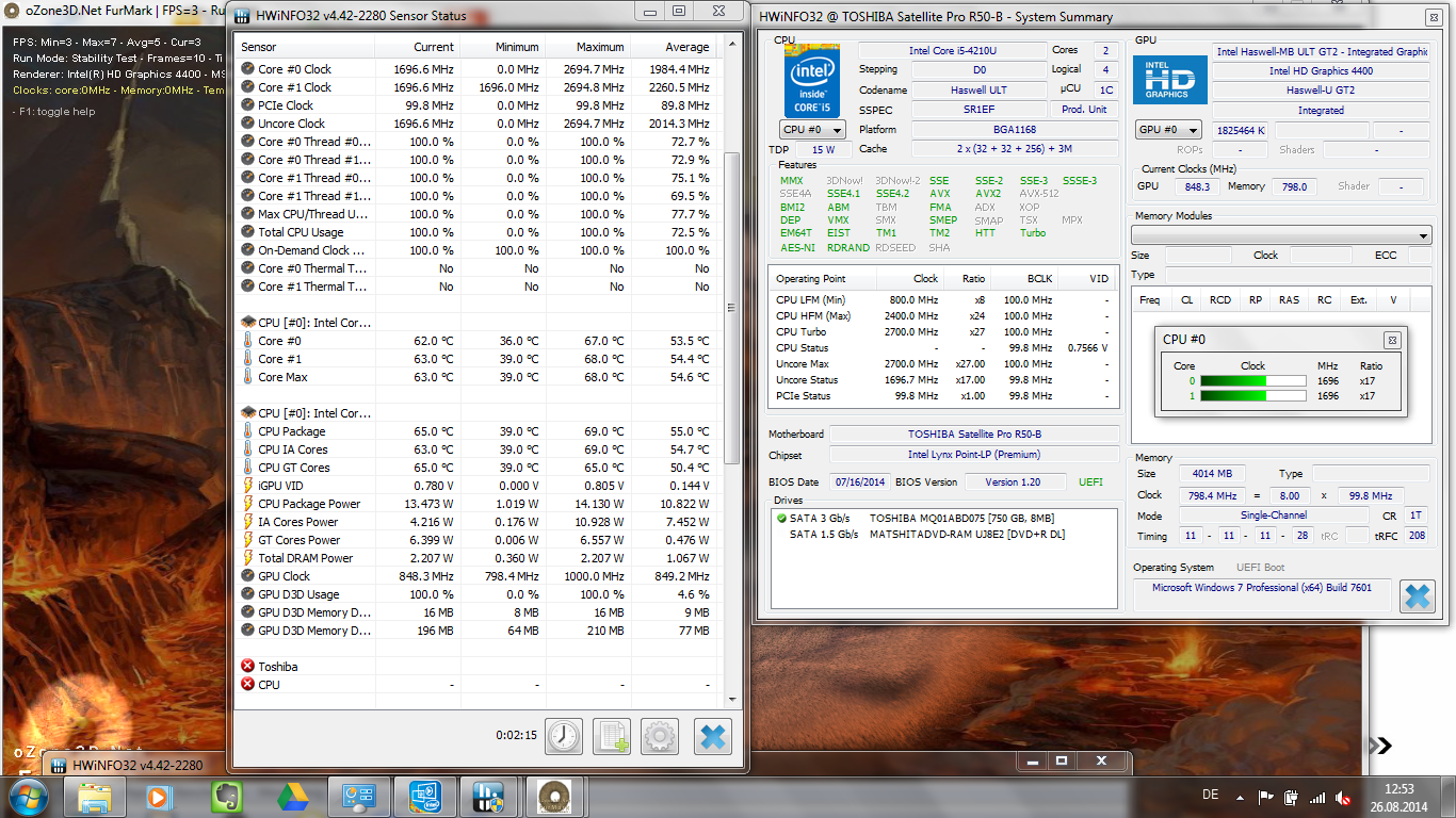 Der 4210U taktet im Turbo-Mode theoretisch bis 2,7 GHz (Single-Core) bzw. bis 2,4 GHz (Multi-Core). Dies finden wir im R50 bestätigt, die CPU fährt also volle Kraft bei normalen, rechenintensiven Anwendungen. Die integrierte HD 4400 beackert ihren OpenGL-Test mit 850 MHz, das liegt unter ihren Möglichkeiten von bis zu 1.100 MHz. Die Performance-Unterschiede hinsichtlich i5 4200M (HD 4600) sind beträchtliche 65 % (ProBook 450). Wir haben die Cinebench R11.5-Tests (Multi-Rendering / OpenGL) auch im Akkubetrieb ausgeführt und erzielten bei gleichen Taktungen dieselben Scores.