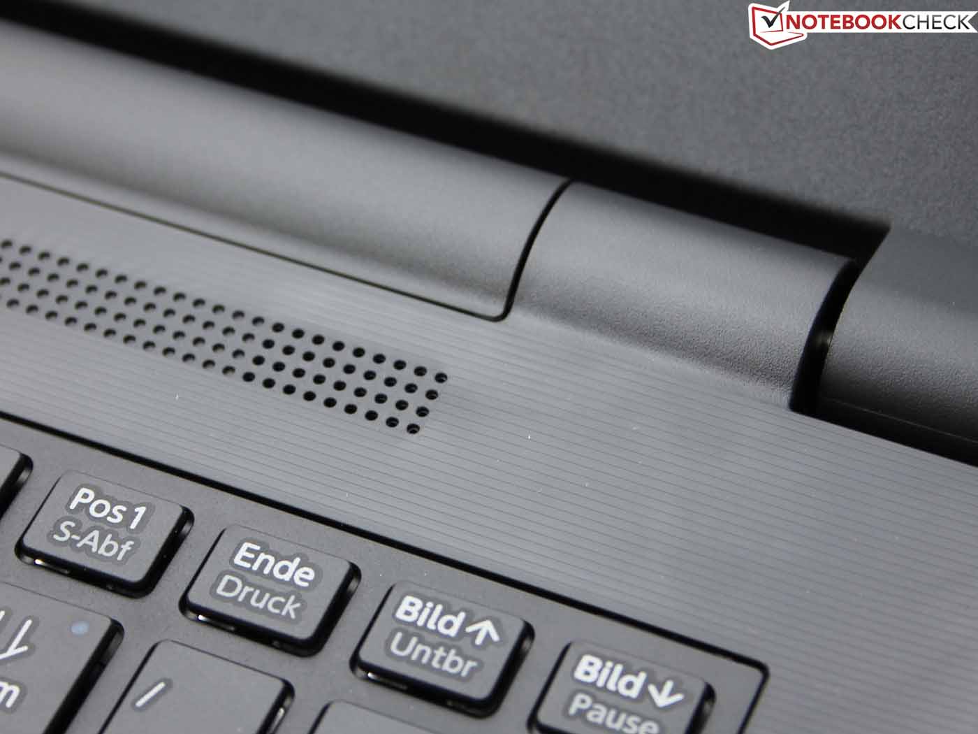 Die Lautsprecher geben einen nicht besonders lauten, blechernen Klang wieder. Die Speaker befinden sich über der Tastatur unter dem Lochgitter. Tiefen und Höhen negieren die kleinen Membranen komplett, folglich stellt sich ein undifferenzierter, monotoner Klang ein. Für Lautsprecher oder Kopfhörer gibt es auf der linken Seite eine Kopfhörer/Mikrofon Kombi-Buchse.