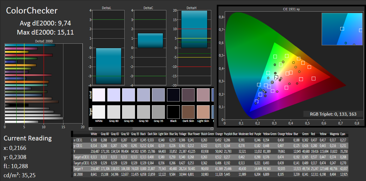 ΔE ColorChecker Calman: 9.74 | ∀{0.5-29.43 Ø4.78}