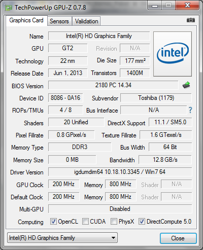 | Toshiba Satellite Pro R50-B-112 HD Graphics 4400, 4210U, TOSHIBA MQ01ABD075 | Acer Extensa 2510-34Z4 HD Graphics 4400, 4030U, Western Digital Scorpio Blue WD5000LPVX | Acer TravelMate P455-M-54204G50Makk HD Graphics 4400, 4200U, Seagate Momentus Thin ST500LT0 12-9WS142 | Lenovo ThinkPad L540 20AV002YGE HD Graphics 4600, 4200M, Hitachi Travelstar Z7K500 HTS725050A7E630 | |