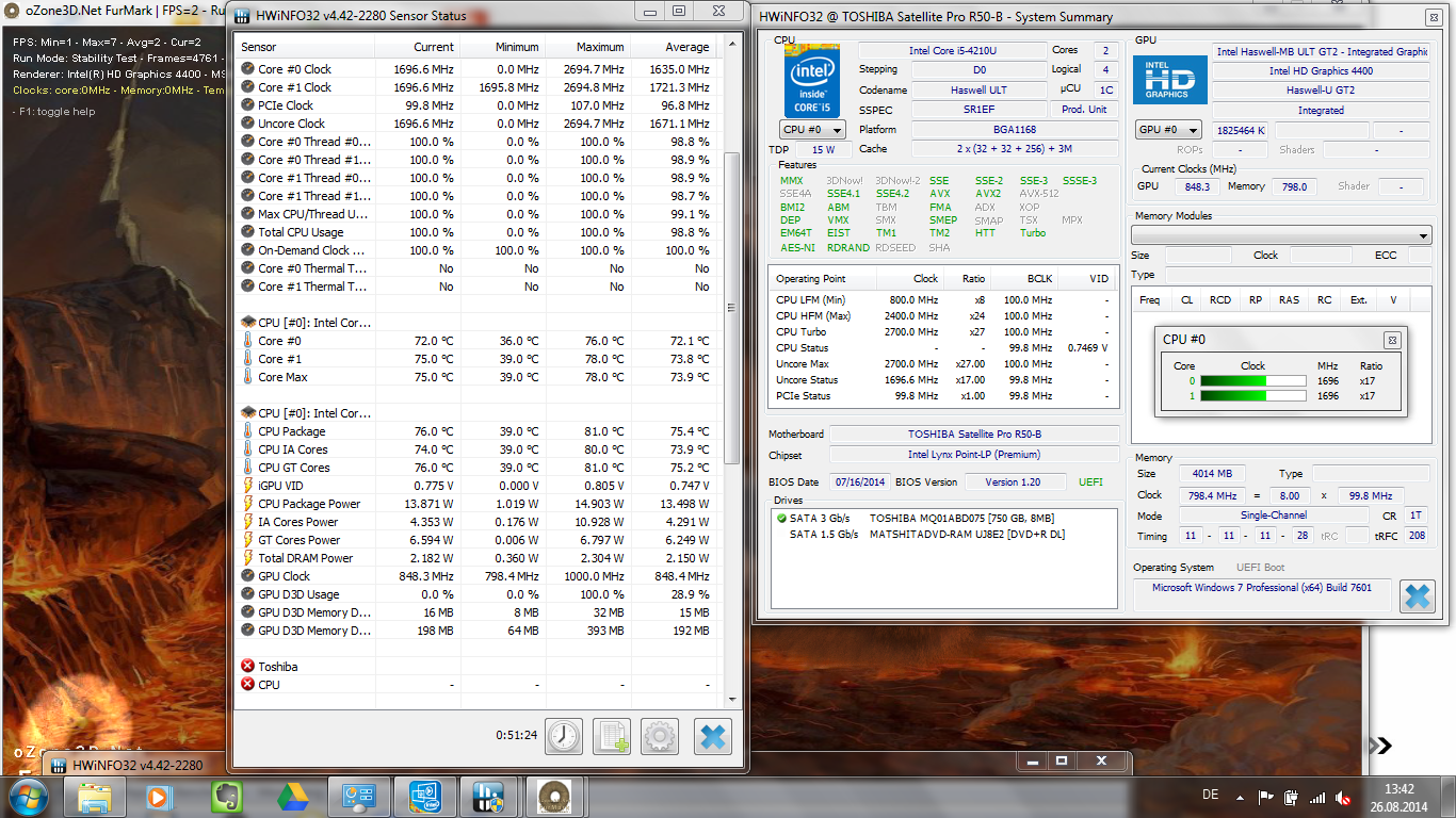Den Stresstest inszenieren wir, um zu prüfen, wie Kühlsystem und Chassis mit anhaltender Höchstlast umgehen. Die CPU meldet 74 Grad Celsius, während sie unter ihrer Turbo-Range mit konstant 1,7 GHz rechnet. Theoretisch wären 2,4 GHz drin, was bei obigen Cinebench-Tests auch anlag. Bei dauerhaftem Stress, zeitglich mit der IGP, wird jedoch nur der Standard-Takt gehalten. Wir sprechen folglich noch nicht von CPU-Throttling. Die GPU bearbeitet ihren Stresstest zeitgleich mit 850 MHz. Nach Beendigung des praxisfernen Szenarios ist die Turbo-Range sofort wieder nutzbar, wie ein direkt im Anschluss ausgeführter Cinebench-Test zeigte.