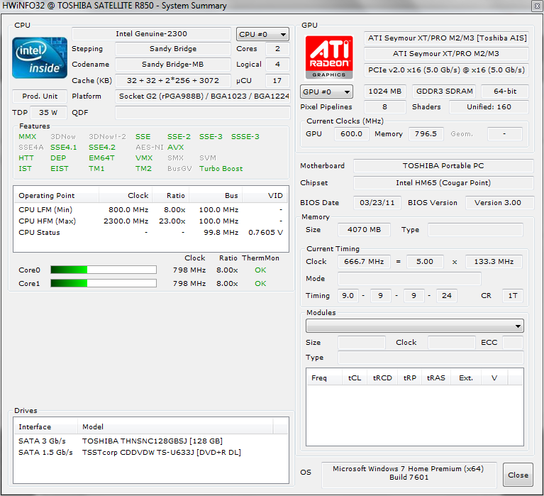Als Arbeitsspeicher ist ein 4GB DDR3-Modul mit 1333 MHz verbaut. Über eine Wartungsklappe an der Unterseite des Notebooks kann leicht ein weiterer Arbeitsspeicher-Riegel hinzugefügt werden. 4GB RAM sollten für die meisten Anwendungen allerdings ausreichend sein. Als Besonderheit bietet das Satellite R850-127 eine 128GB umfassende SSD als Massenspeicher an. Auch die Festplatte ist durch eine Wartungsklappe leicht zugänglich. Wie diese sich auf die Systemperformance auswirkt, folgt weiter unten.