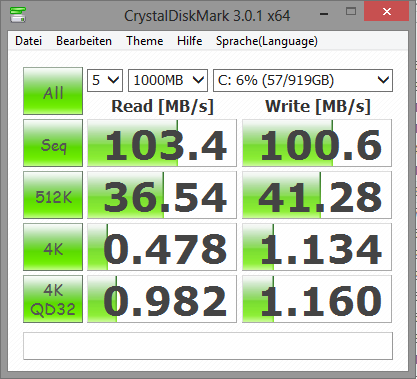Toshiba bestückt das Satellite mit einer Festplatte aus der Travelstar-5K1000-Serie von HGST. Die Platte arbeitet mit 5.400 Umdrehungen pro Minute. An Speicherplatz wird es bei einer Kapazität von 1 TB so schnell nicht mangeln. CrystalDiskMark meldet eine Lesegeschwindigkeit von 103,4 MB/s. HD Tune liefert eine durchschnittliche Transferrate von 78,4 MB/s. Diese Werte gehen für eine 5.400er-Festplatte in Ordnung.